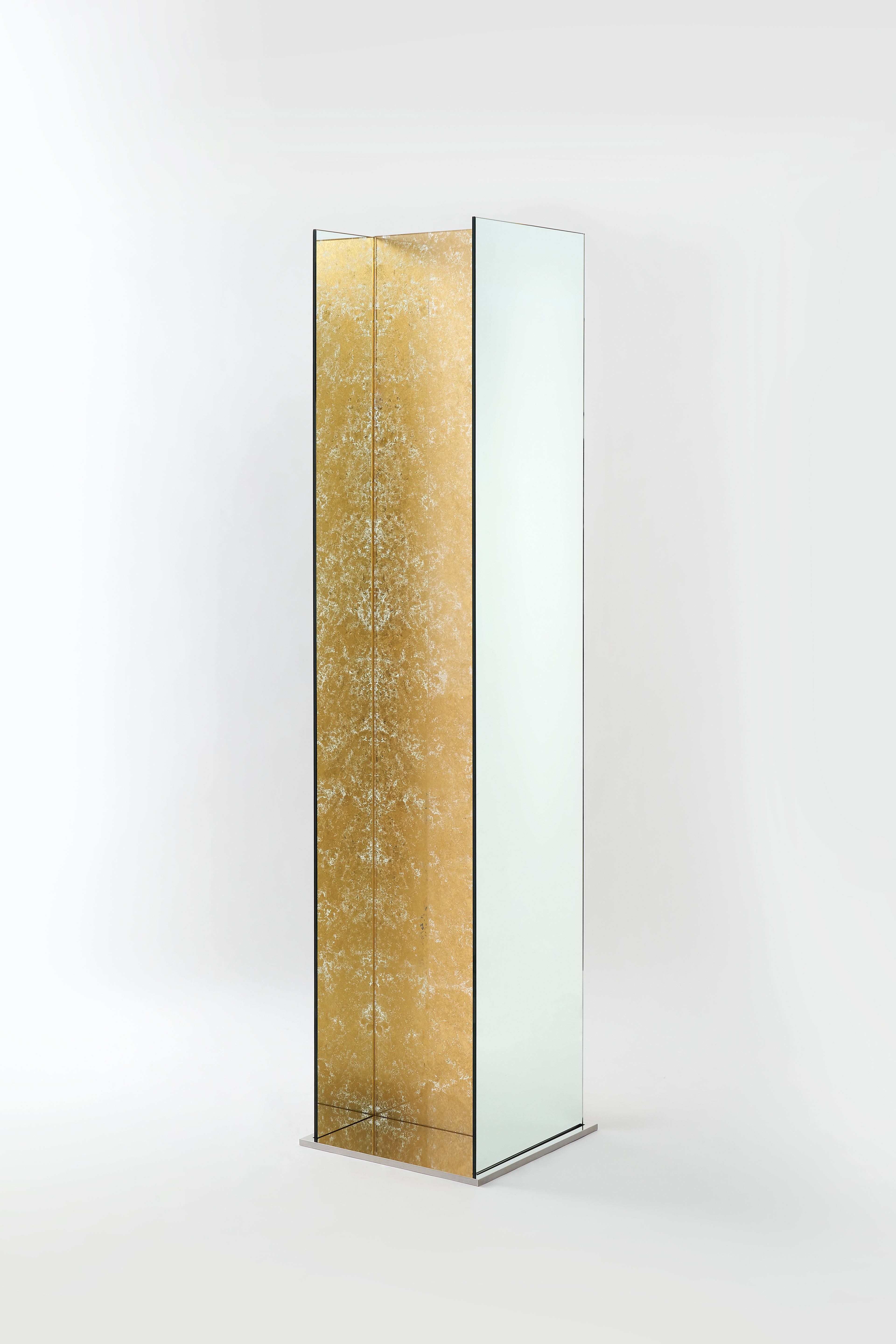 This standing full-length mirror was inspired by the moment when the light from nowhere beyond the horizon reaches the sky after dawn. The infinitely repeating mirrors are fantastically expressed as if they are being sucked in. It is structurally strong by using the H structure, and the lower part of the mirror is made of a metal plate to support it stably.