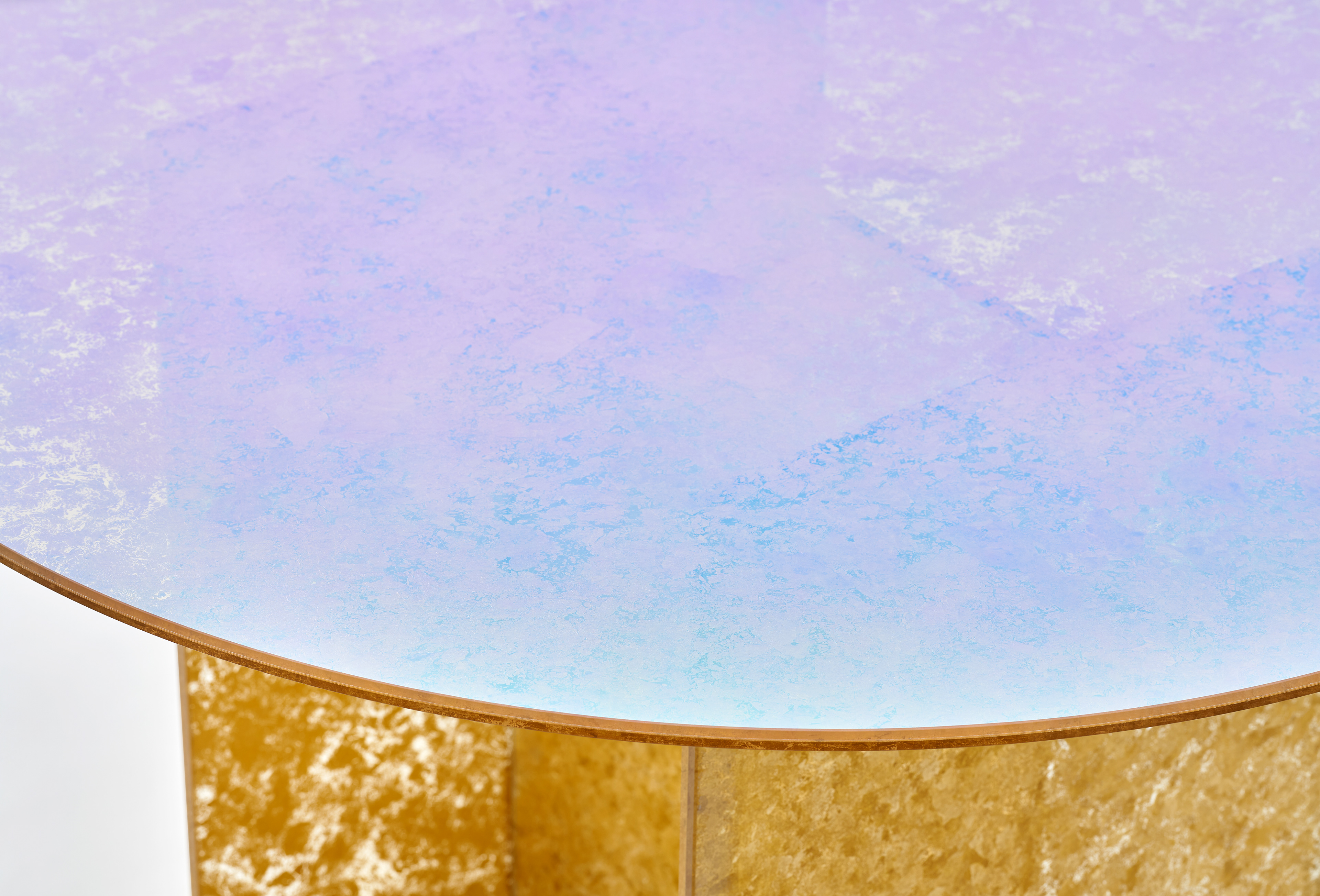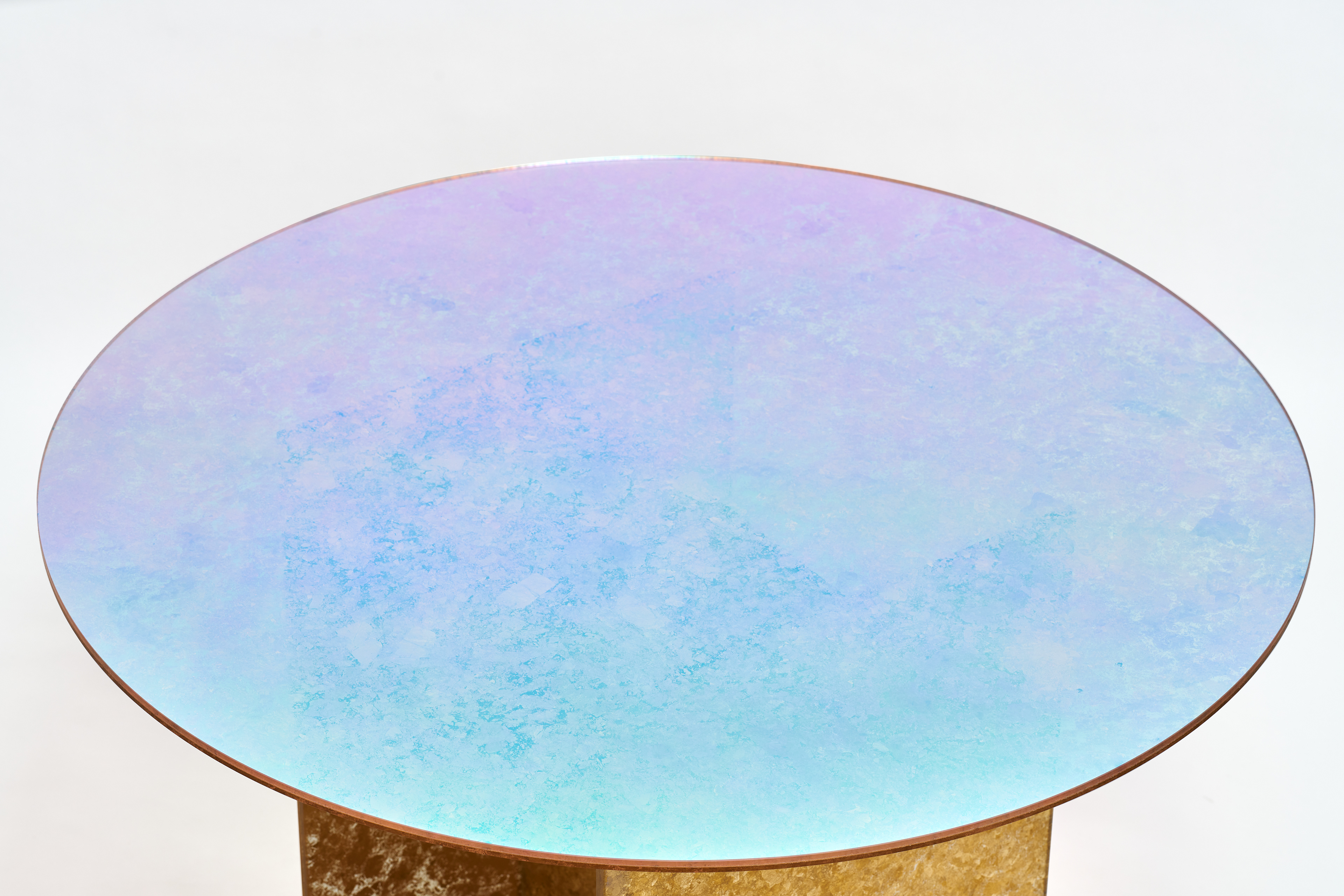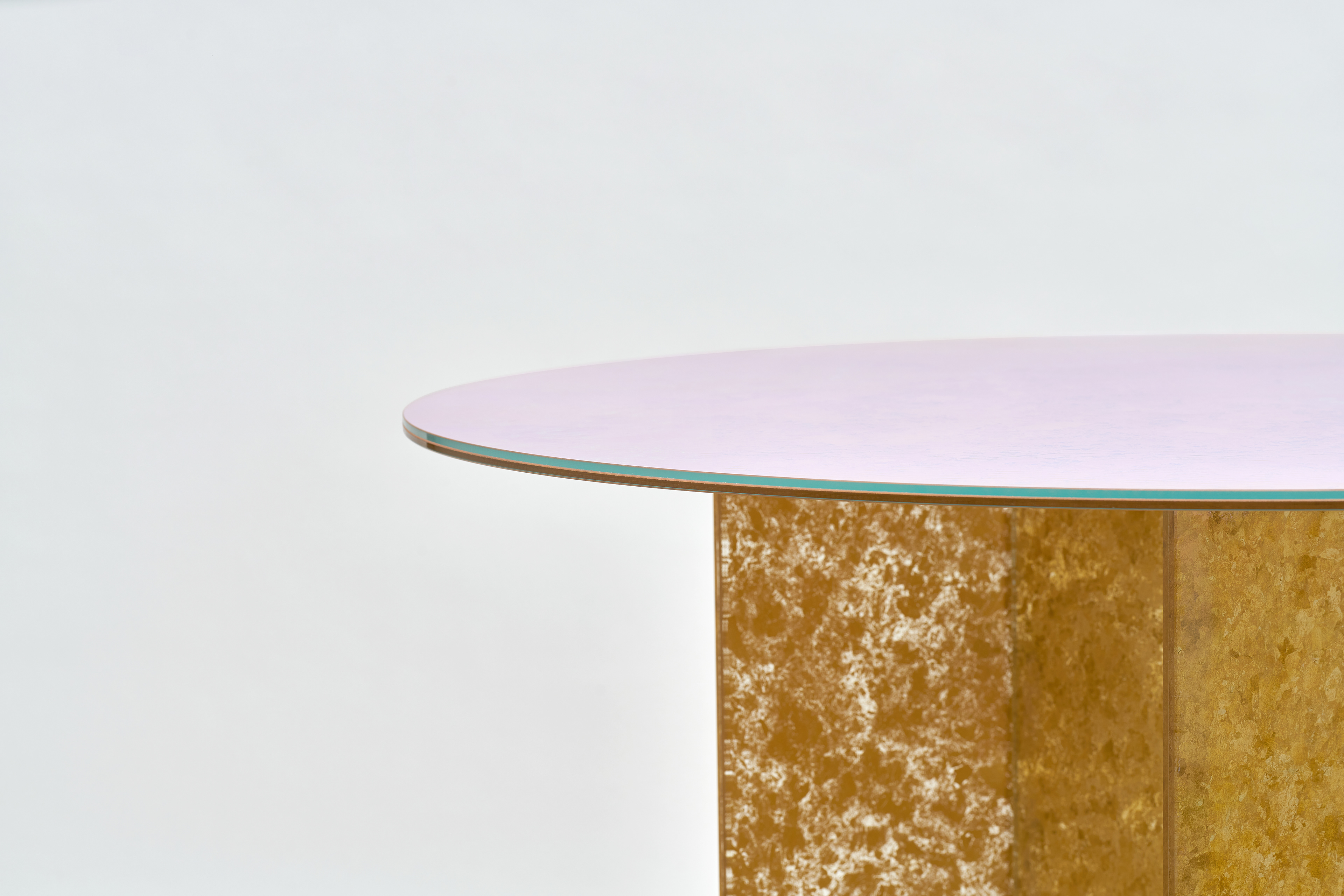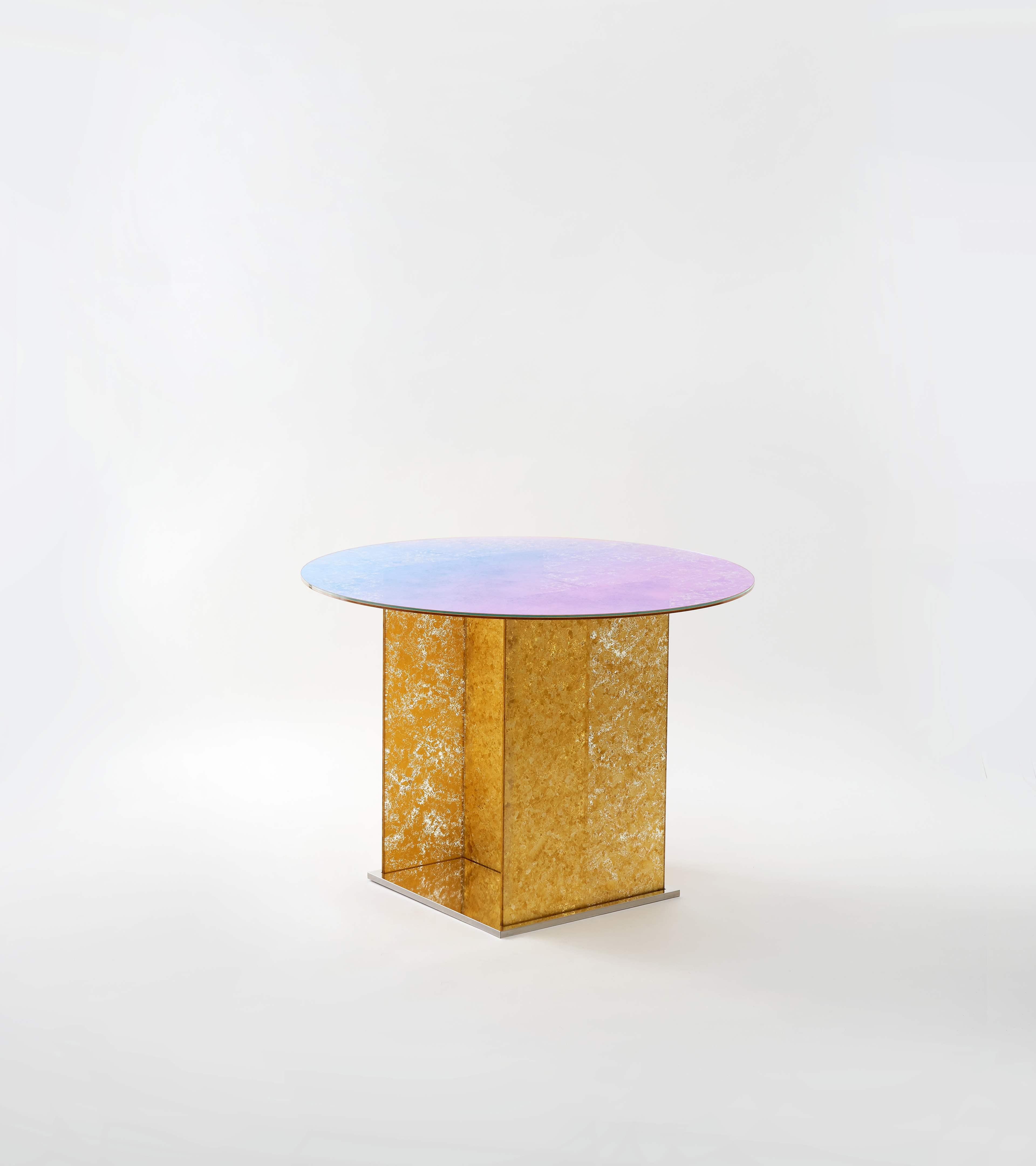This table was designed with inspiration from the scenery of the sea where a calm morning rises after the moment when the light reaches the sky. It is an elegant and splendid table with intense iridescent colors appearing according to the change of light, moving and reflecting like magic, and moving fascinatingly according to the intensity of light with the participation of gold leaf artisans in collaboration. The base of the detachable table is structurally strong using an H structure, and the bottom of the table is made of a metal plate to support it stably. Made of UV-bonded and laminated glass, it has excellent impact and absorption power, making it safe from accidents.